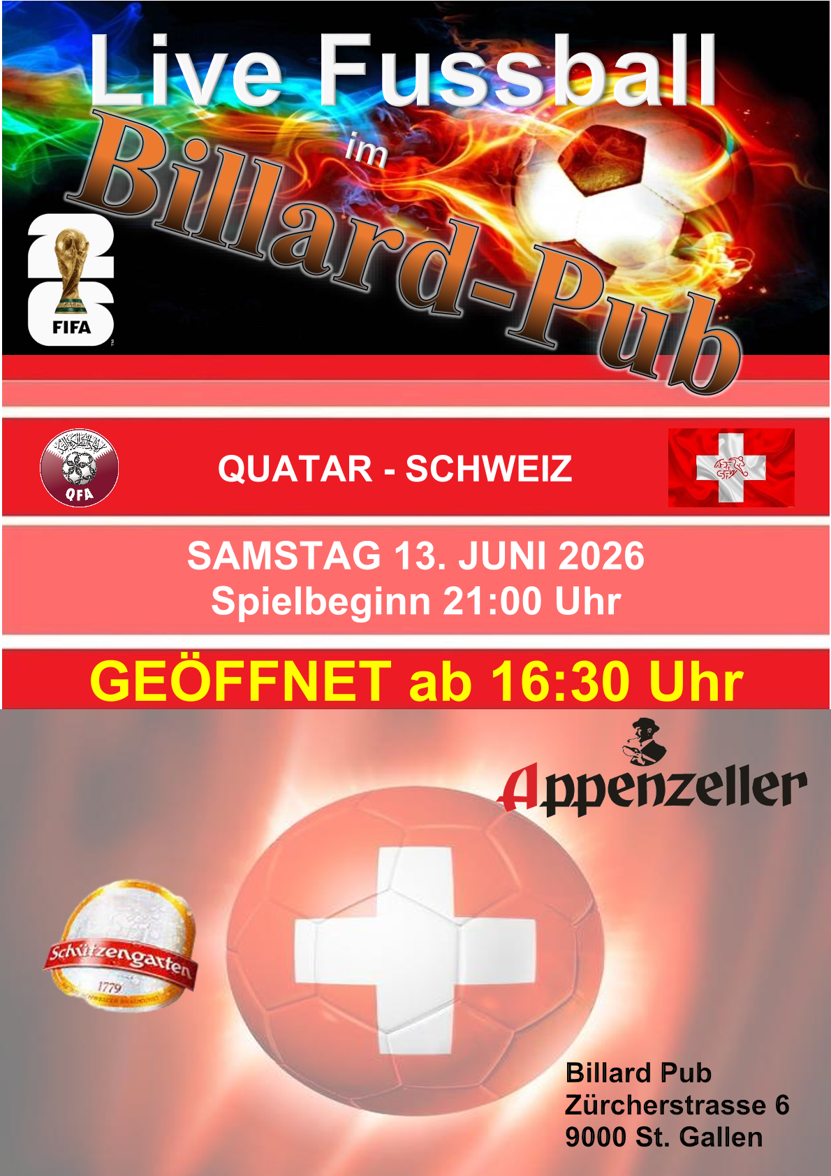 QUATAR – SCHWEIZ 13. Juni / 21:00 - 23:00 Billard Pub Zürcherstrasse 6, St. Gallen, Switzerland Fussball Schweiz