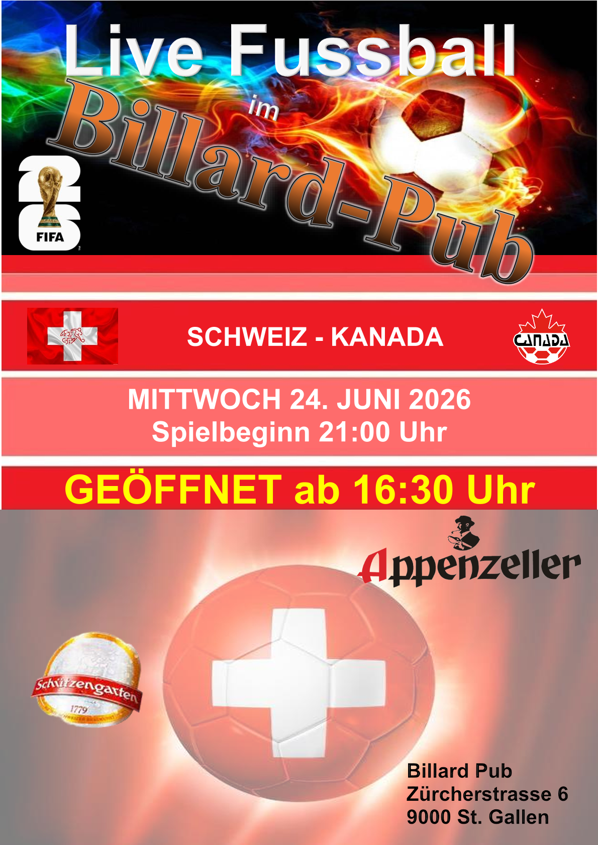 SCHWEIZ – KANADA 24. Juni / 21:00 - 23:00 Billard Pub Zürcherstrasse 6, St. Gallen, Switzerland Fussball Schweiz