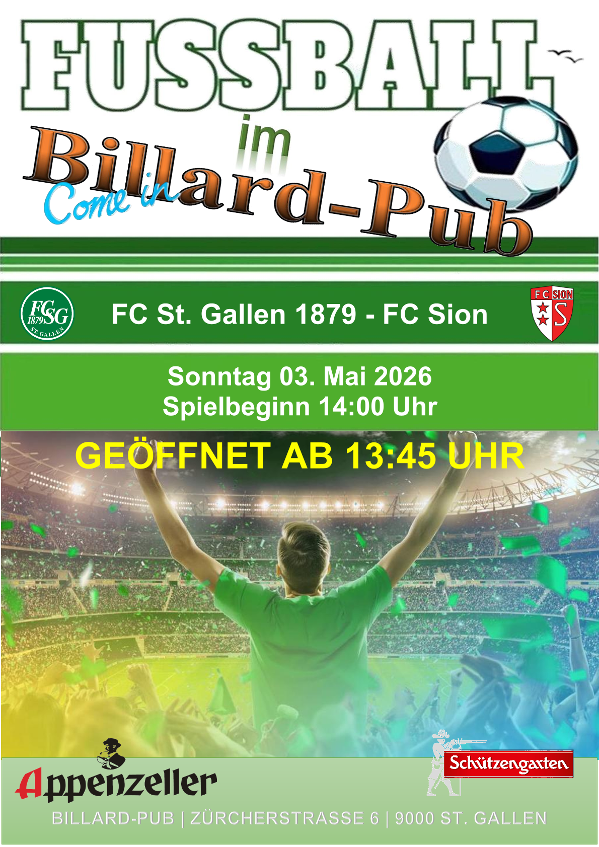 FC St.Gallen 1879 – FC Sion 3. Mai / 14:00 - 16:00 Billard Pub Zürcherstrasse 6, St. Gallen, Switzerland Fussball FCSG