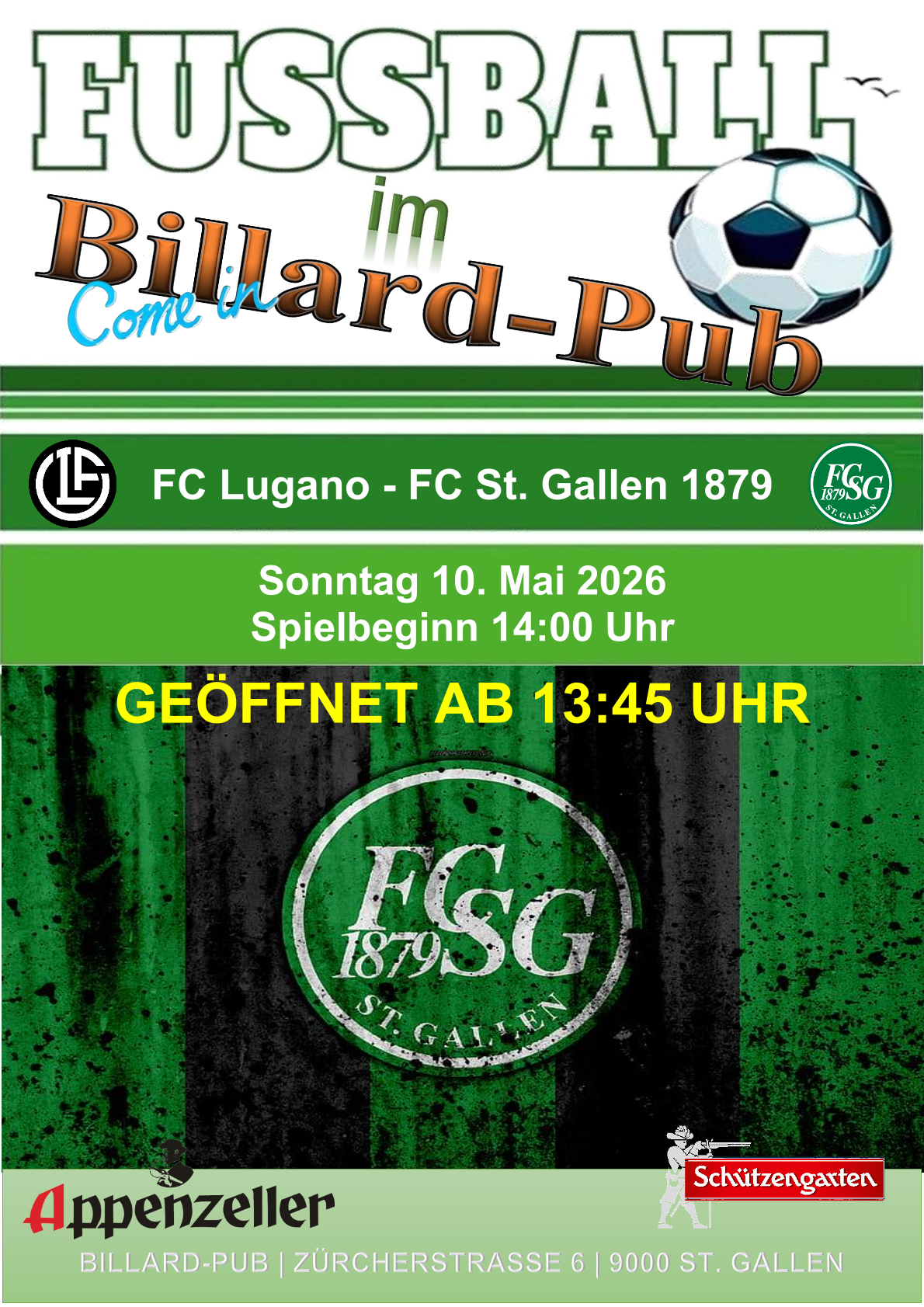 FC Lugano – FC St.Gallen 1879 10. Mai / 14:00 - 16:00 Billard Pub Zürcherstrasse 6, St. Gallen, Switzerland Fussball FCSG