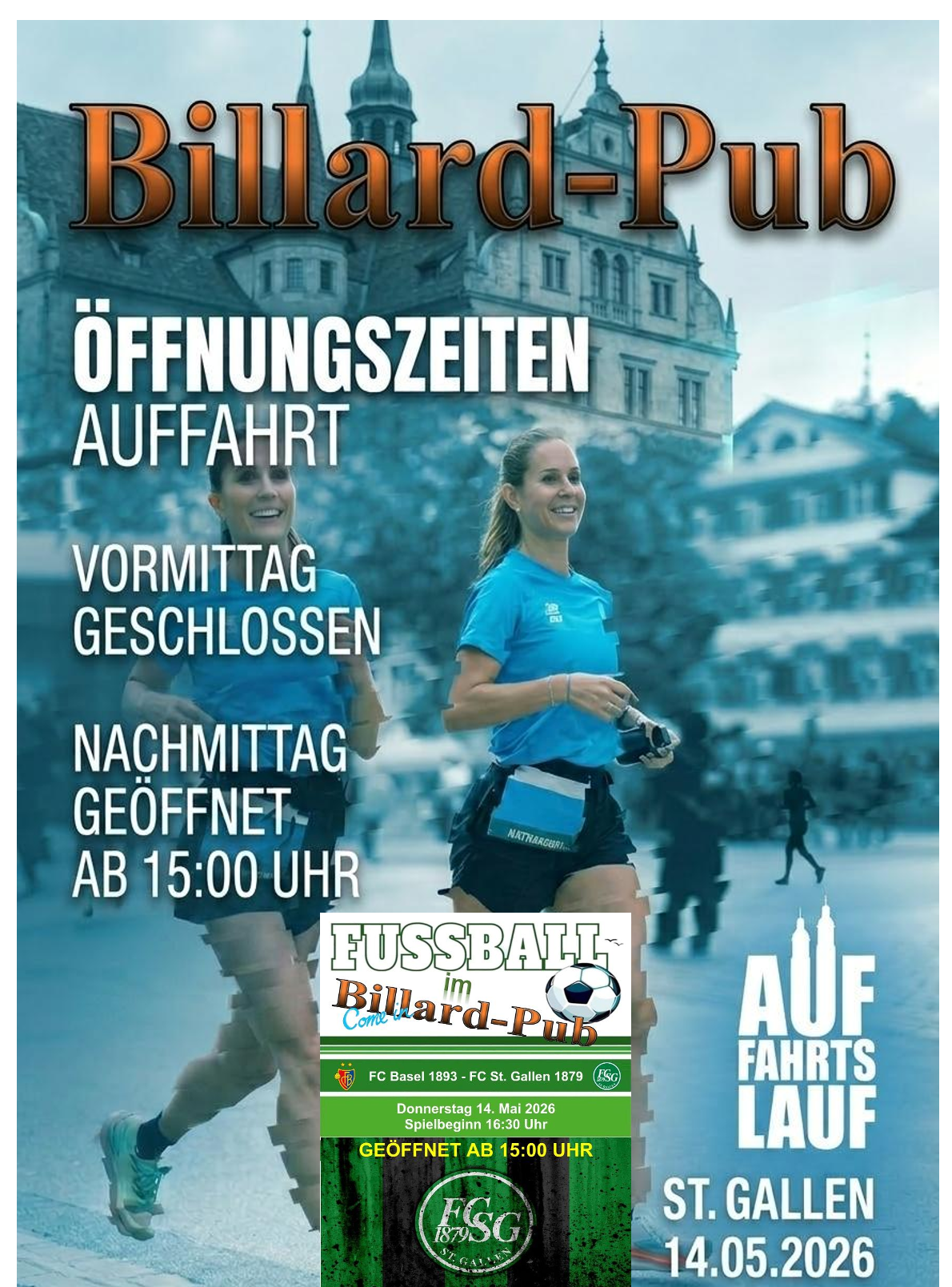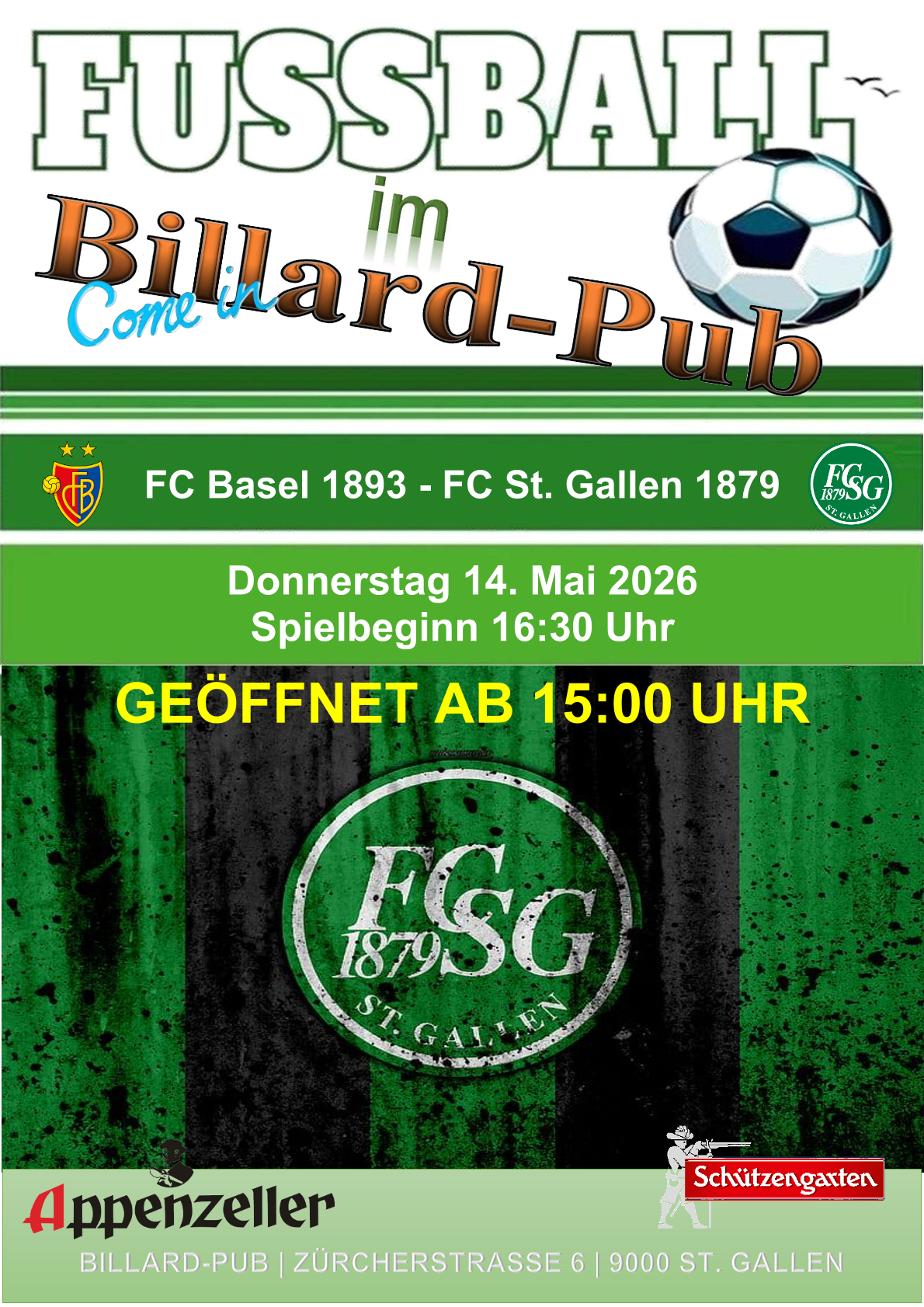 FC Basel 1893 – FC St.Gallen 1879 14. Mai / 16:30 - 18:30 Billard Pub Zürcherstrasse 6, St. Gallen, Switzerland Fussball FCSG