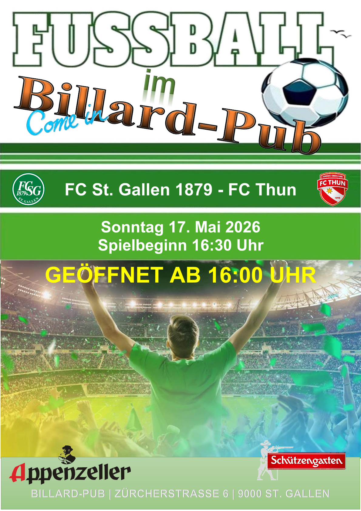 FC St.Gallen 1879 – FC Thun 17. Mai / 16:30 - 18:30 Billard Pub Zürcherstrasse 6, St. Gallen, Switzerland Fussball FCSG