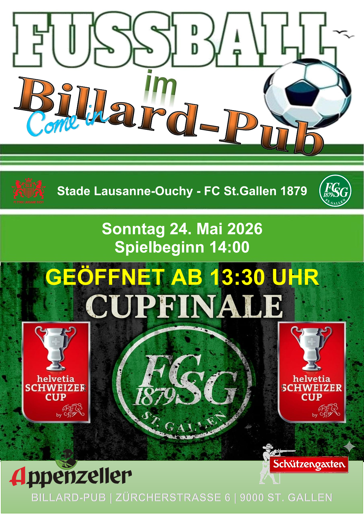 Cupfinale: Stade Lausanne-Ouchy – FC St. Gallen 1879 24. Mai / 14:00 - 16:00 Billard Pub Zürcherstrasse 6, St. Gallen, Switzerland Fussball FCSG