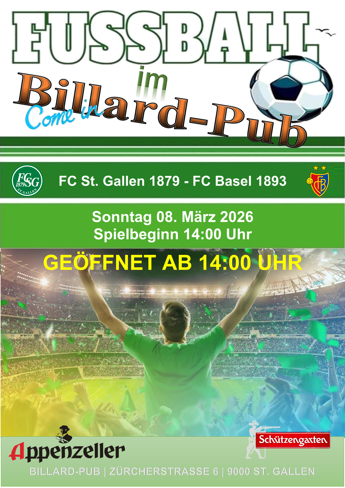 FC St. Gallen 1879 – FC Basel 1893 8. März / 14:00 - 16:00 Billard Pub Zürcherstrasse 6, St. Gallen, Switzerland Fussball FCSG