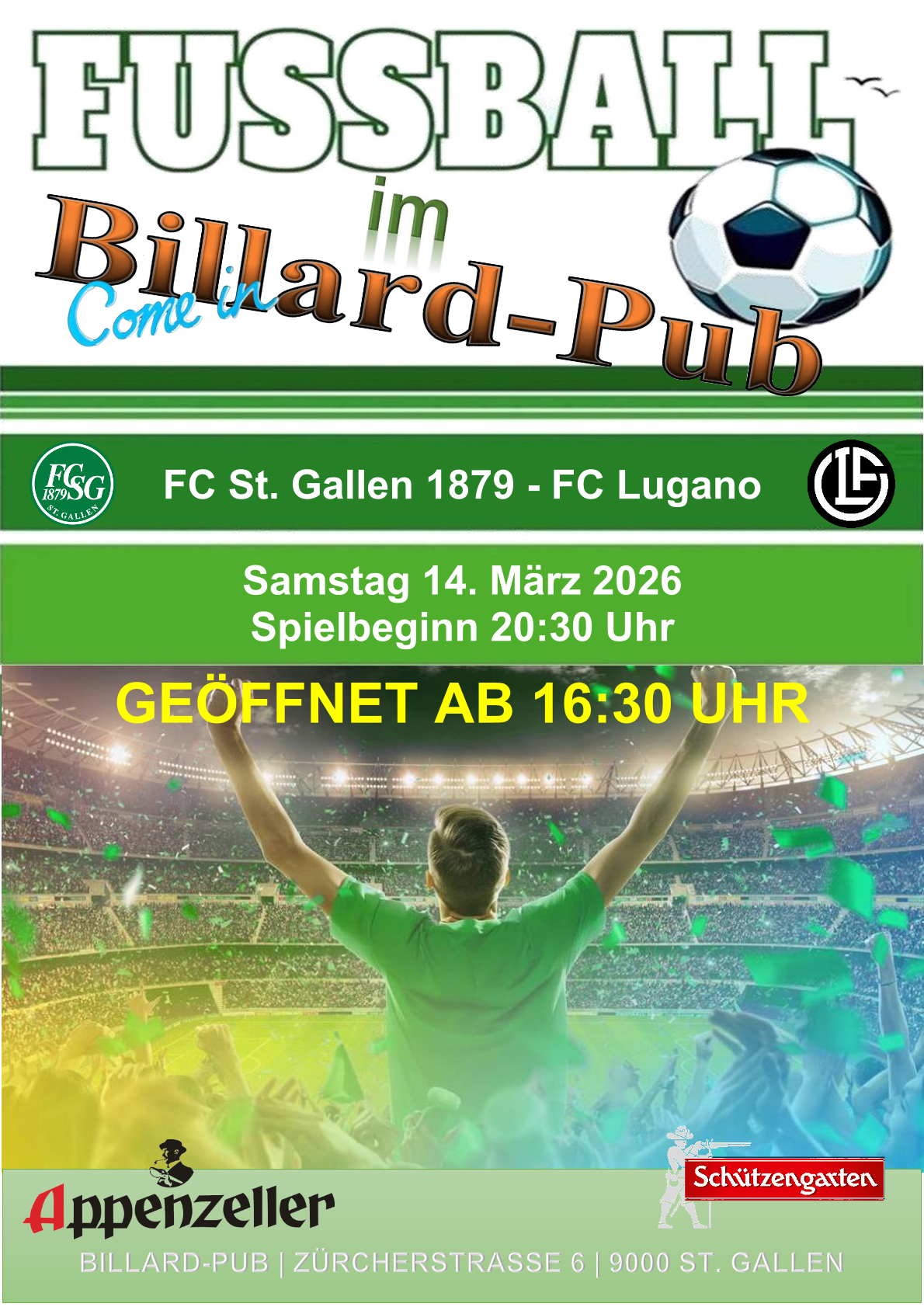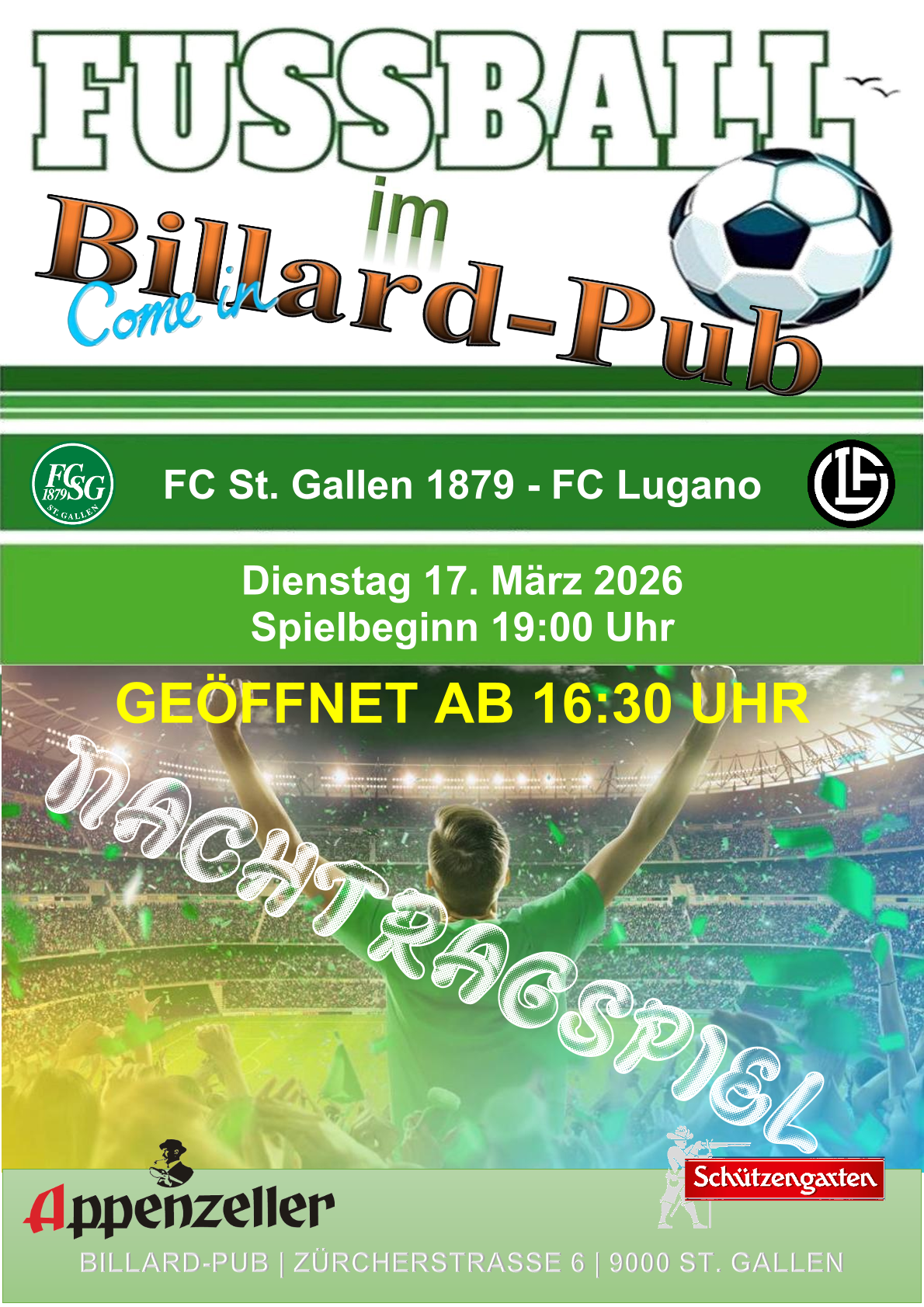 FC St. Gallen 1879 – FC Lugano (Nachholspiel) 17. März / 19:00 - 21:00 Billard Pub Zürcherstrasse 6, St. Gallen, Switzerland Fussball FCSG