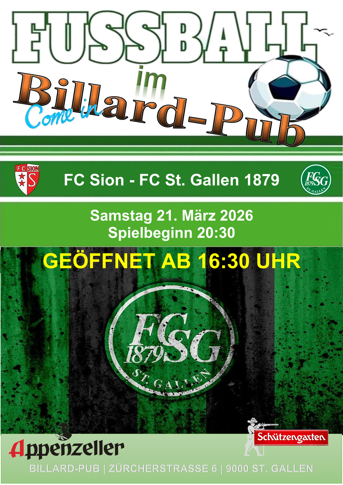 FC Sion – FC St. Gallen 1879 21. März / 20:30 - 22:30 Billard Pub Zürcherstrasse 6, St. Gallen, Switzerland Fussball FCSG