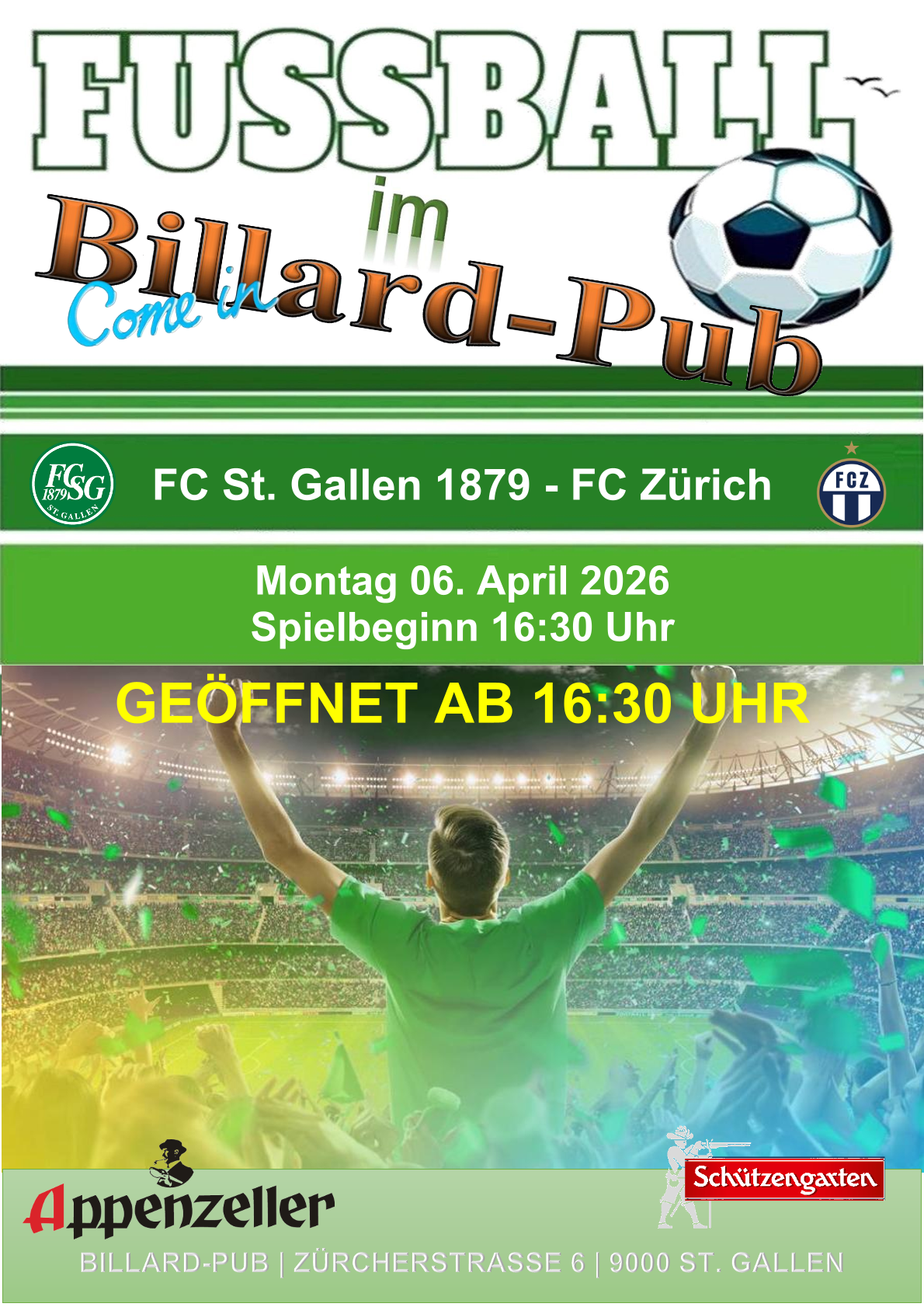 FC St. Gallen 1879 – FC Zürich 6. April / 16:30 - 18:30 Billard Pub Zürcherstrasse 6, St. Gallen, Switzerland Fussball FCSG