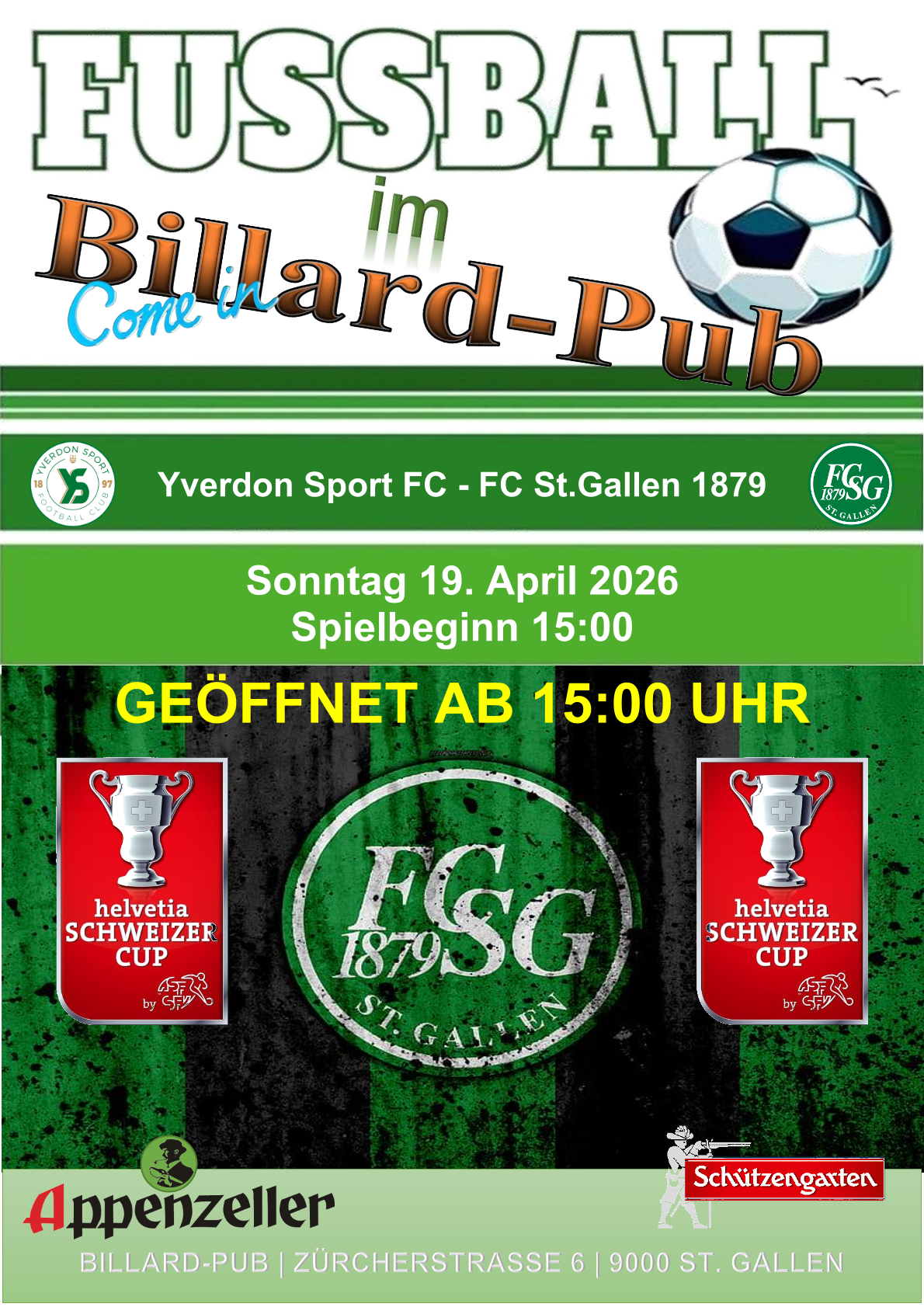Yverdon Sport FC – FC St.Gallen 1879 (Cup Halbfinale) 19. April / 15:00 - 17:00 Billard Pub Zürcherstrasse 6, St. Gallen, Switzerland Fussball FCSG