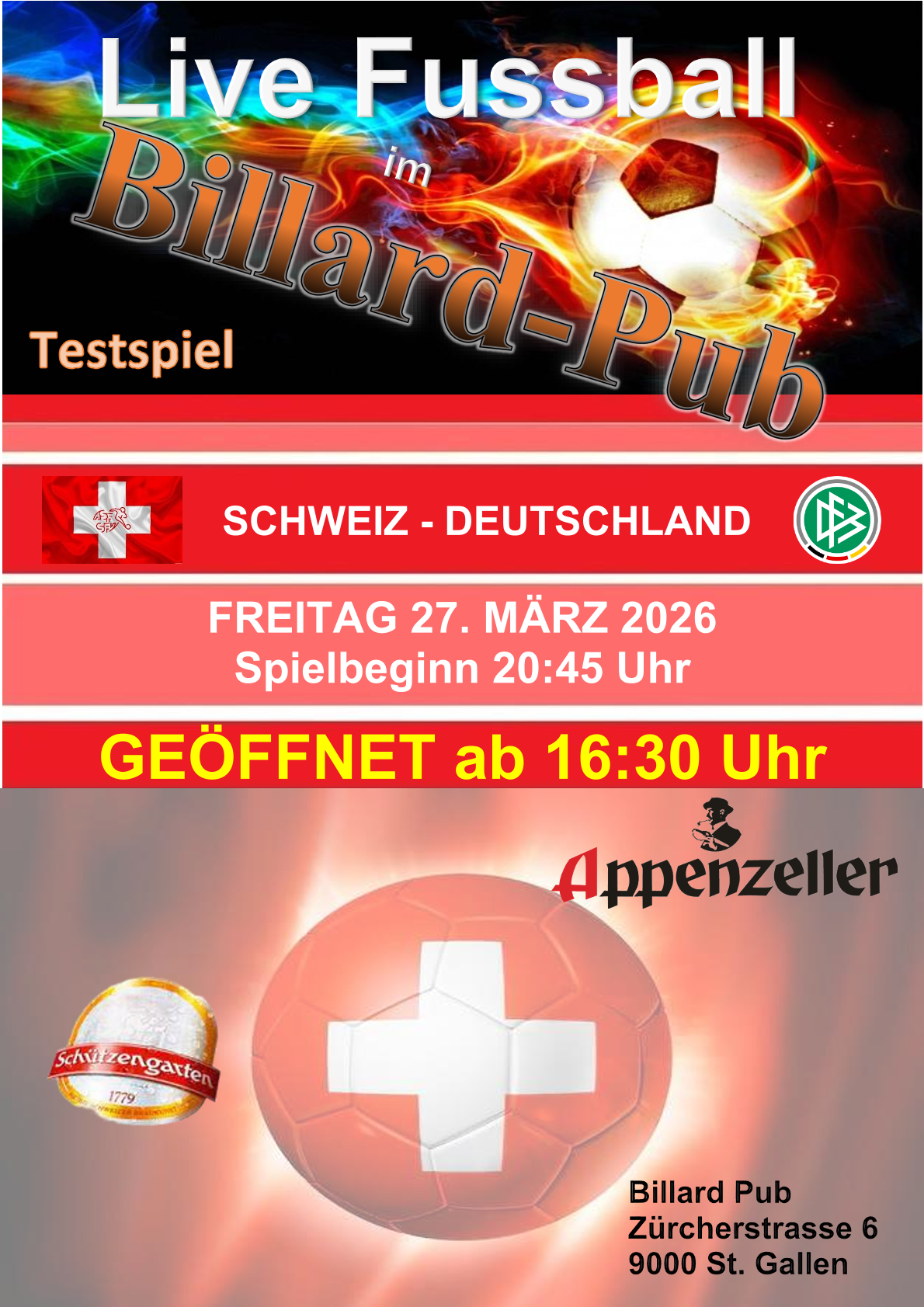SCHWEIZ – DEUTSCHLAND (Testspiel) 27. März / 20:45 - 22:45 Billard Pub Zürcherstrasse 6, St. Gallen, Switzerland Fussball Schweiz