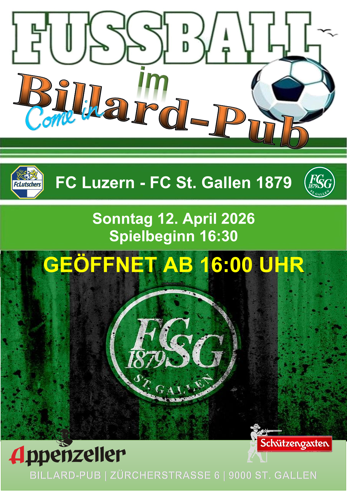 FC Luzern – FC St. Gallen 1879 12. April / 16:30 - 18:30 Billard Pub Zürcherstrasse 6, St. Gallen, Switzerland Fussball FCSG