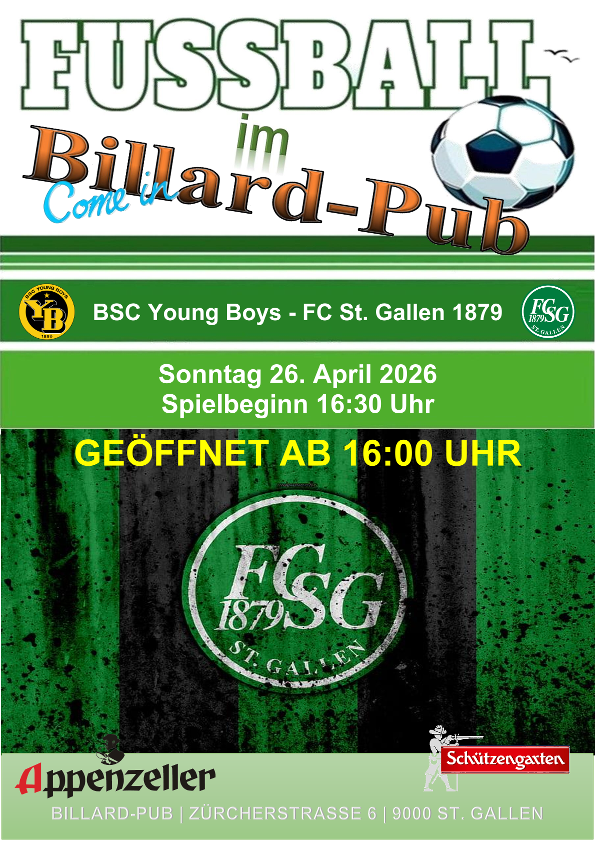 BSC Young Boys – FC St.Gallen 1879 26. April / 16:30 - 18:30 Billard Pub Zürcherstrasse 6, St. Gallen, Switzerland Fussball FCSG