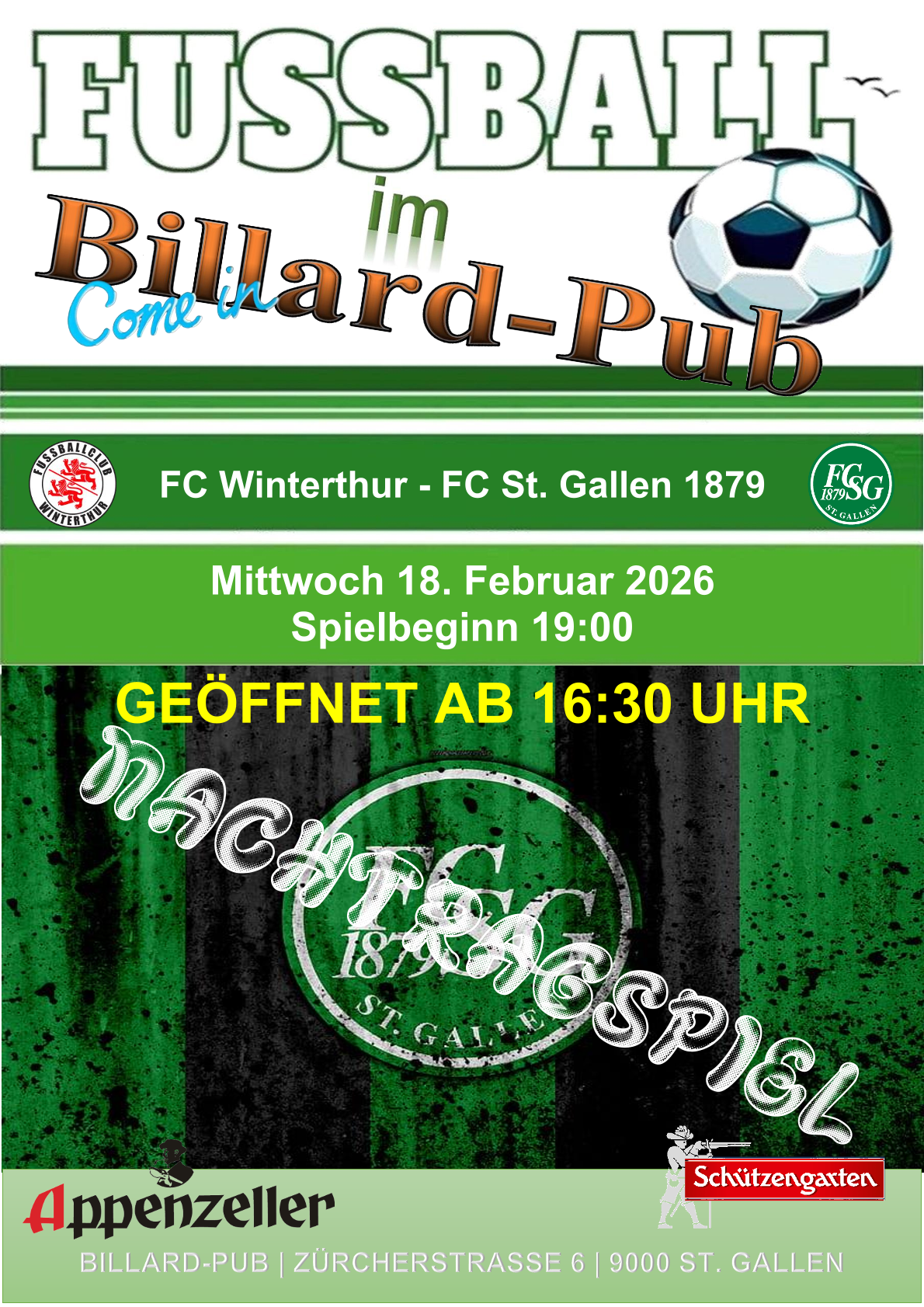 FC Winterthur – FC St. Gallen 1879 18. Februar / 19:00 - 21:00 Billard Pub Zürcherstrasse 6, St. Gallen, Switzerland Fussball FCSG