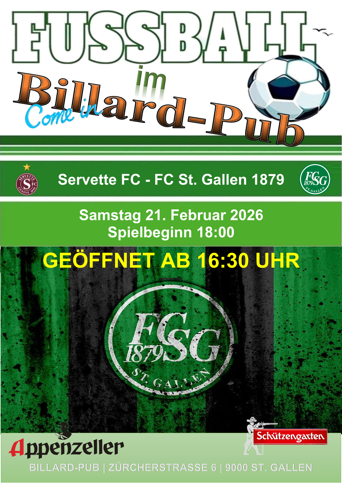 Servette FC – FC St. Gallen 1879 21. Februar / 18:00 - 20:00 Billard Pub Zürcherstrasse 6, St. Gallen, Switzerland Fussball FCSG