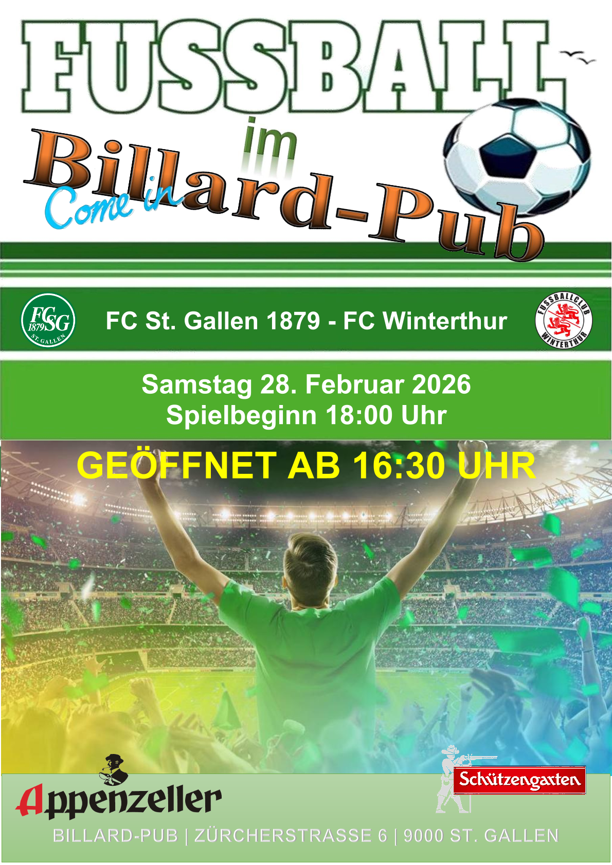 FC St. Gallen 1879 – FC Winterthur 28. Februar / 18:00 - 20:00 Billard Pub Zürcherstrasse 6, St. Gallen, Switzerland Fussball FCSG