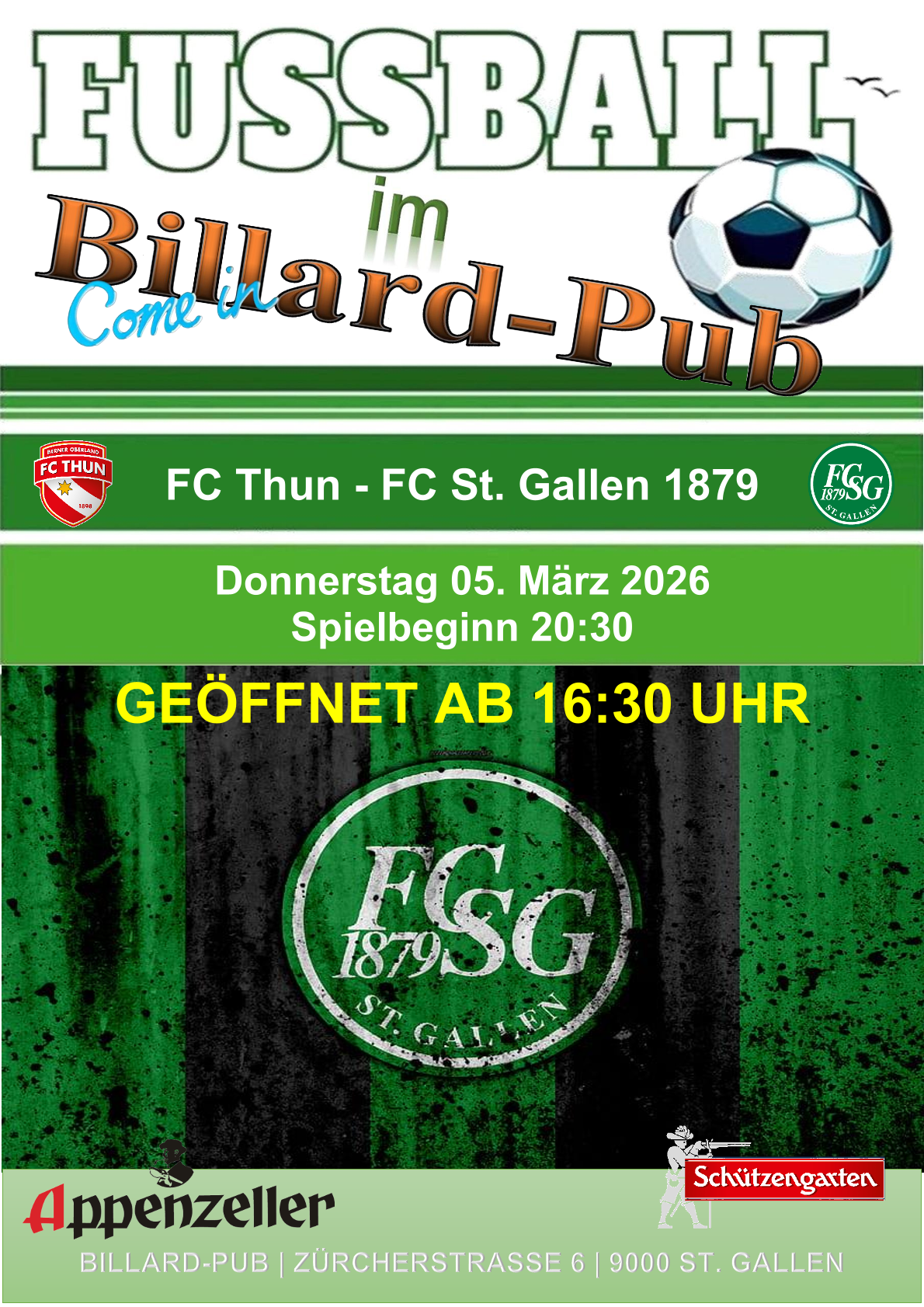 FC Thun – FC St. Gallen 1879 5. März / 20:30 - 22:30 Billard Pub Zürcherstrasse 6, St. Gallen, Switzerland Fussball FCSG